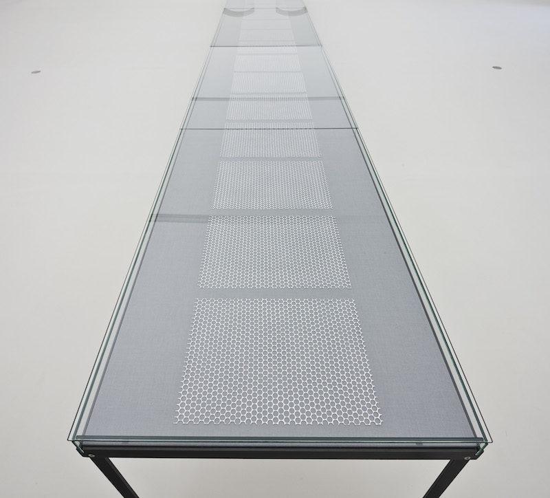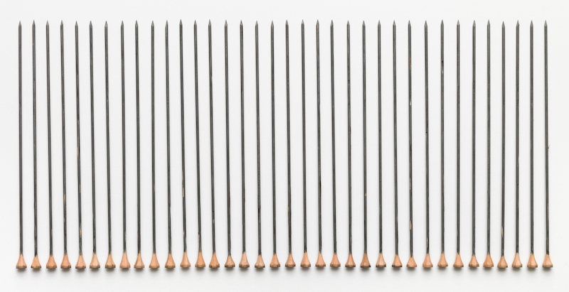For Pencils, he uses a knife to chip off the wood around pencils in flakes until he reaches the lead at the center of each. Rather than direct us to what these tools might make, the artist demonstrates how his steadily applied attention transformed them. Similarly, for his tools, he continually grinds blades on whetting stones, gradually wearing down the edges. In each of these series, Krause uses basic acts of cutting, wearing, sharpening using the uniform tools by which art is commonly made. His Primer series works are achieved by his application of numerous layers of primer to both sides of a piece of paper, resulting in fragile but dense objects. For his Hand Drawings Krause draws lines freehand, lengthwise and crosswise, as if on squared paper, as with his Paper Cut Work, for which Krause cuts by hand using a knife to carve out holes that are as round as possible from white sheets of paper. In these two series, the artist acts as ordering principle, reclaiming by hand, or by art, what more advanced tools might achieve.